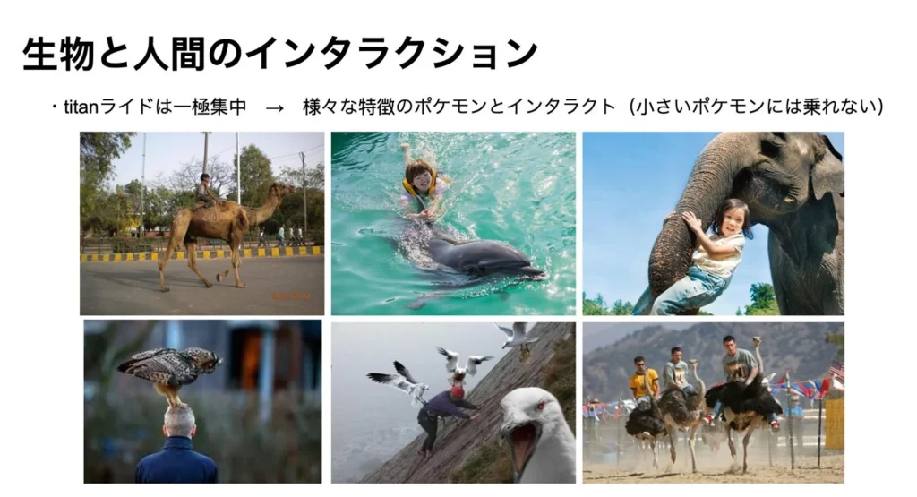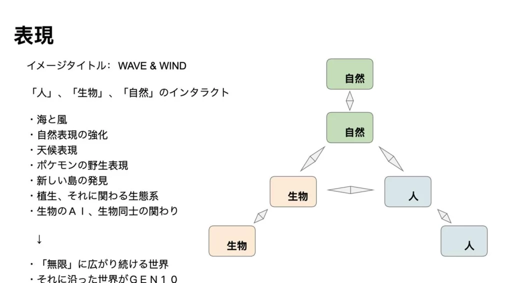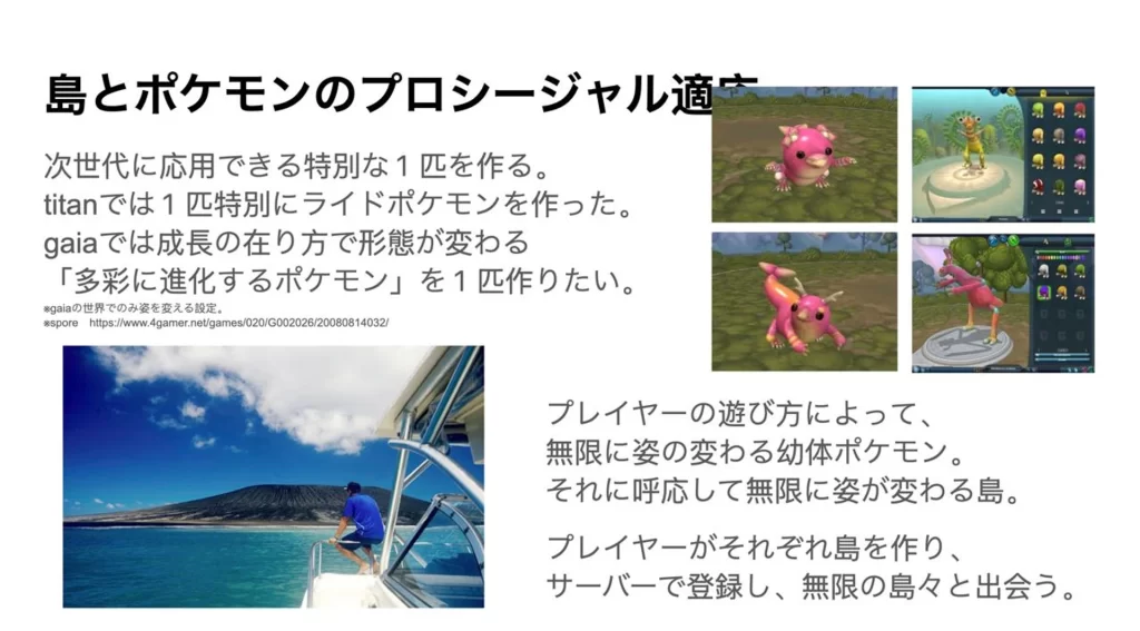 大森氏(会議録より): 「それぞれの島に独自の環境があり、そこに適応したポケモンが住んでいる」、あるいは「島に住むポケモンの力が島の環境に影響を与えている」とした場合、我々のアイデアと重複する可能性があります。